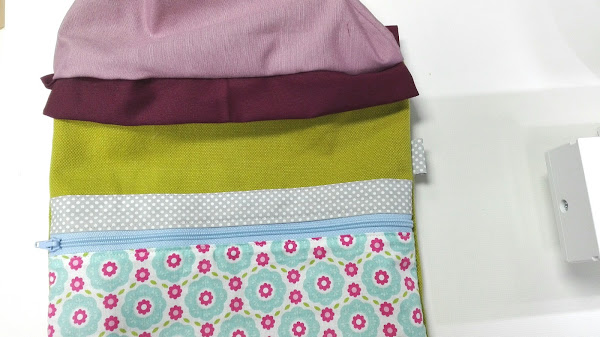 - Empezaremos creando el bolsillo exterior. Para eso coloca las telas de la siguiente forma: la tela exterior del bolsillo con el frente hacia arriba, la cremallera con el carril hacia abajo y encima la tela de forro del bolsillo. Sujeta con alfileres, pinzas o hilván.