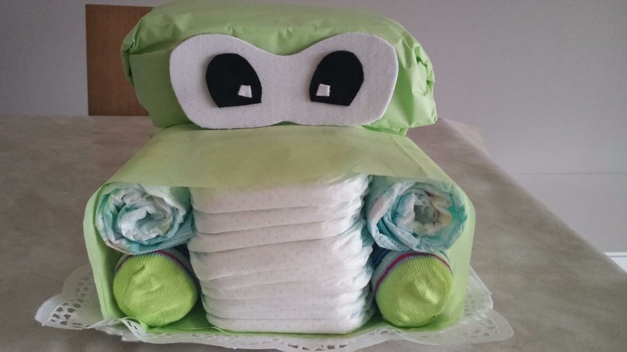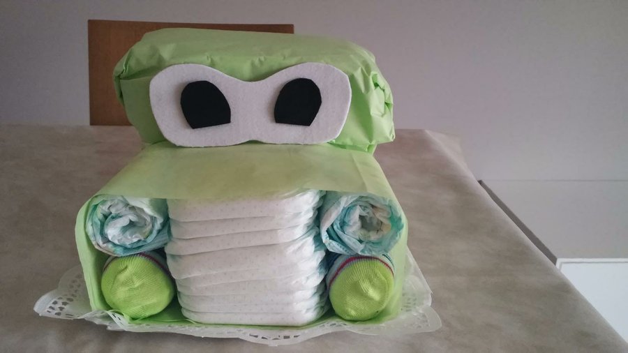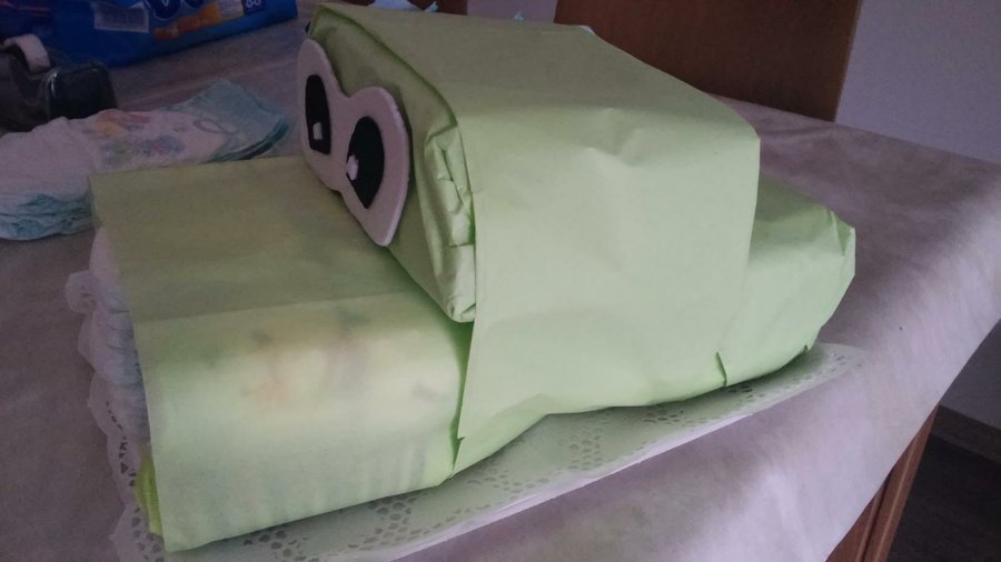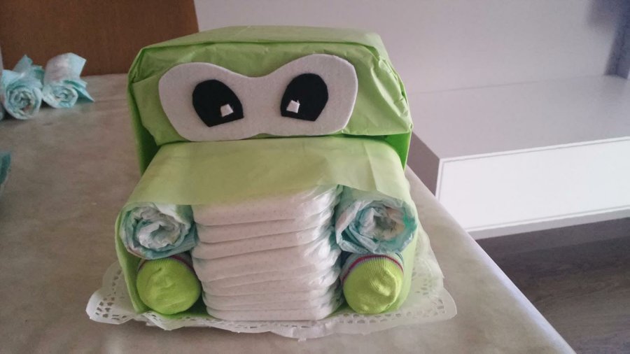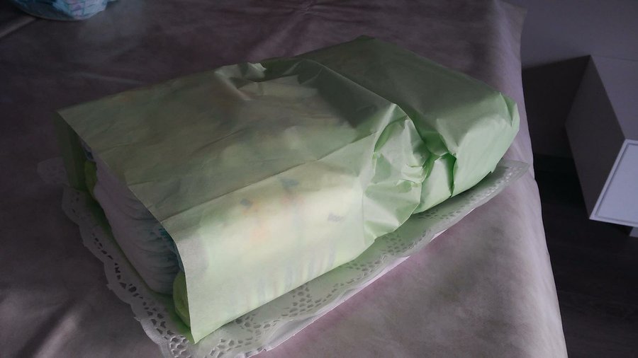 1- Enrollamos 4 pañales. Metemos 2 pañales de los que hemos enrollado en dos calcetines. Hacemos un paquete con 9 pañales centrales, sin enrollar, y a los lados colocamos un pañal con calcetín y otro sin. Los sujetamos con una goma de pollo y envolvemos con una hoja de papel de seda.