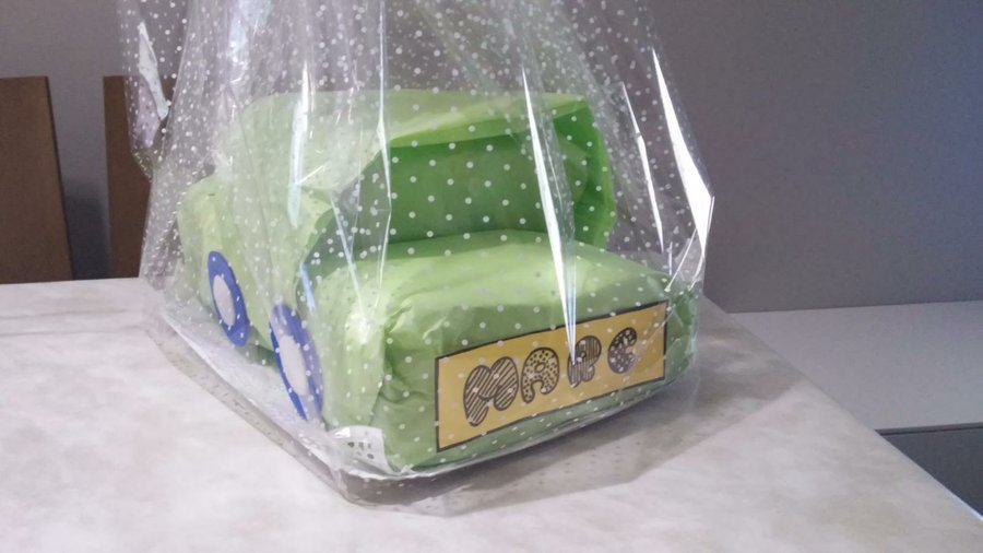 8- Una vez finalizada la decoración del coche, envolvemos con papel de celofán y colocamos un lazo, al gusto.
