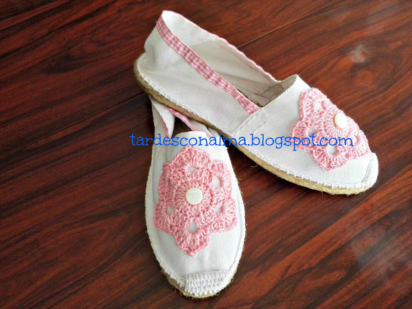 Materiales:AlpargatasHilo Petra DMC en color rosaGanchillo 2,5Cinta de cuadros rosa y blanca2 abalorios de nacarTijeras, hilo rosa, aguja y dedalPuntos empleados:Punto cadenetaPunto enanoPunto bajoPunto alto Hacer 2 Estrellas de 6 puntos siguiendo el gráfico . Coser en el centro a puntada escondida y adornar con el abalorio de nacar justo en el centro. Coser la cinta de cuadros a puntada ...