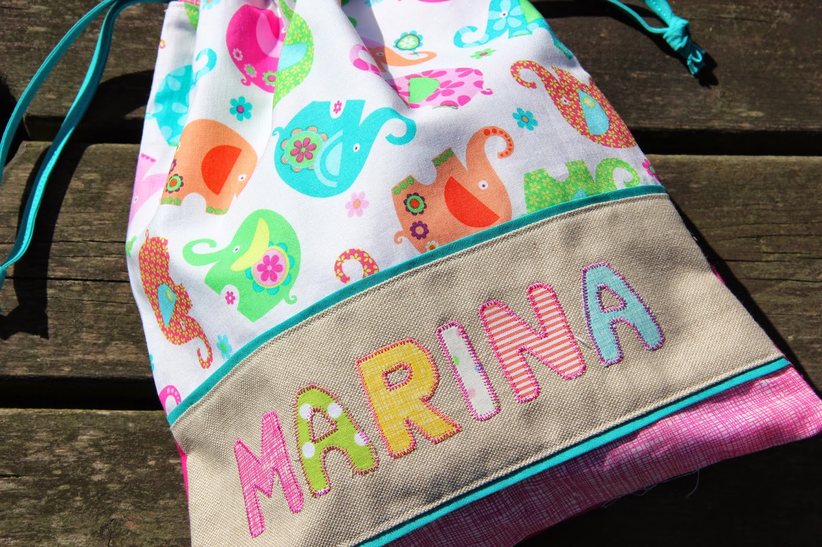 La siguiente bolsita fue un encargo que vino desde Ribadesella (Asturias). La pequeña Marina ya tiene lista su bolsita para empezar a la guardería, con unos elefantitos la mar de simpáticos.