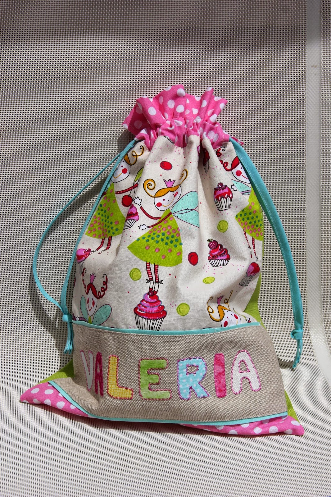 La primera que os quiero enseñar fue un encargo y elegí para hacerla una tela preciosa con unas hadas y cupcakes. La verdad que la combinación de colores fue todo un acierto. A mi me encantó hacerla y ya tengo otras dos encargadas con estas mismas telas.