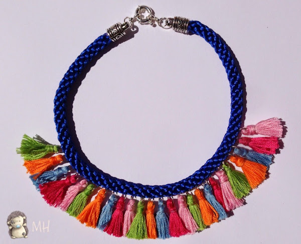 Os gusta mi nuevo collar Kumihimo Étnico con Borlas de Colores? Bueno, quien dice mío dice de mi hija, pero eso es otra historia (conocida por todas las madres del mundo mundial). Me encantan los collares baberos y los collares étnicos, sobre todo para el verano, y éste es tan sencillo que merece la pena.TENÉIS EL PASO A PASO EN MI BLOG, MADRES HIPERACTIVAS. El collar se hace con el mismo esquema ...