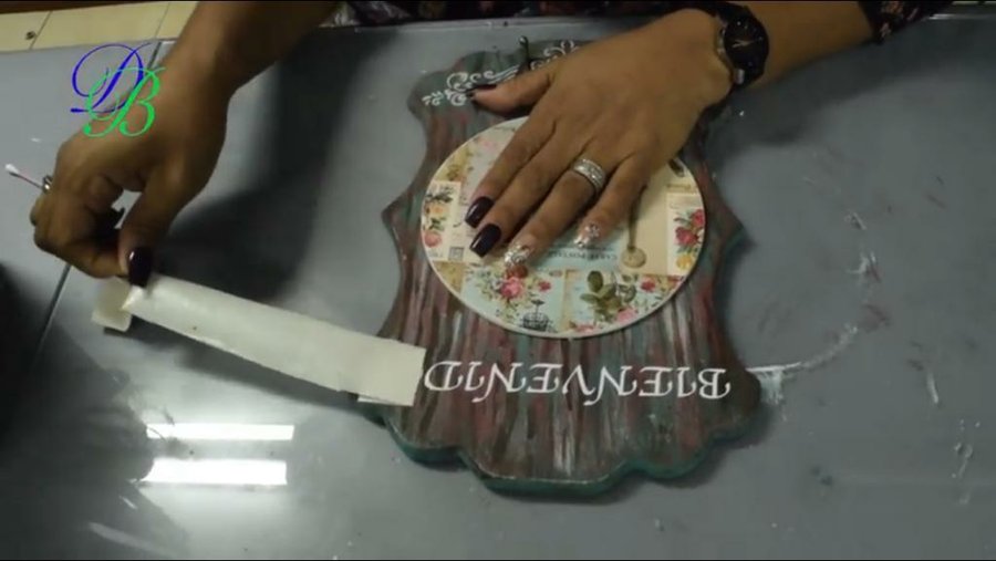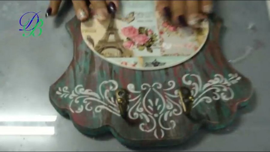Le hicimos con Stencil y pasta para modelar en la parte inferior donde también pagamos los ganchitos para guindar las llaves