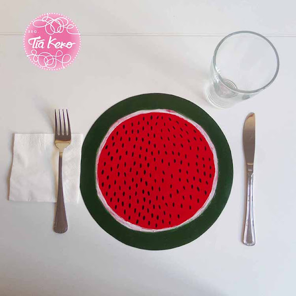 Y como paso final, cuando ya está seco y terminado damos una mano de barniz brillo al agua y listo. Todo lo anterior lo haremos en los dos lados del salvamantel para que pongamos el lado que pongamos tengamos una sandia.
