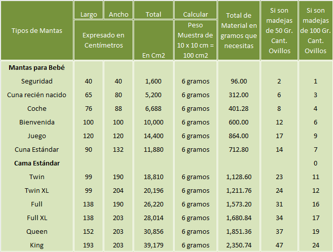 En el cuadro detallamos las dimensiones de las mantas o cobijas, la dimensión está expresada en centímetros cuadrados. Dependiendo del material que utilicemos debemos de tejer una pequeña muestra, en este caso el peso de nuestra muestra de 10 cm x 10 cm es de 6 gramos.