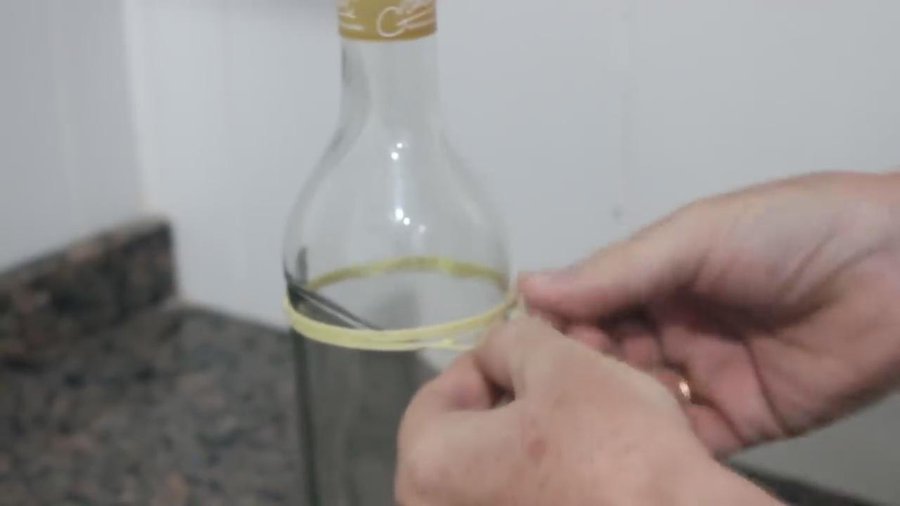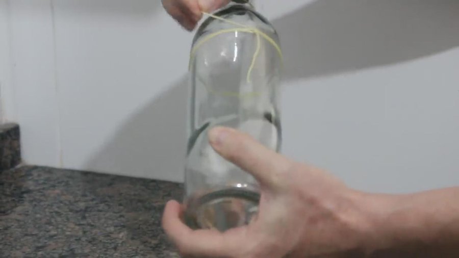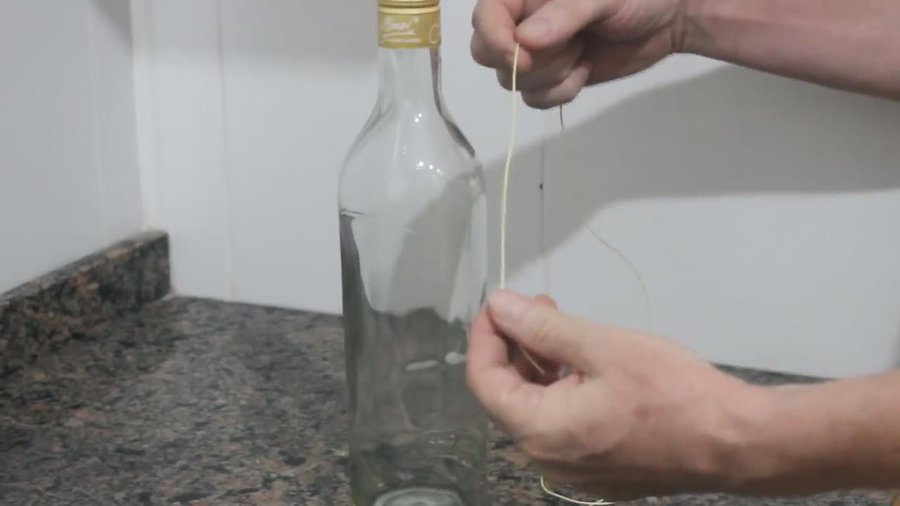 Antes de comenzar asegúrate de que la botella que vayas a cortar esté limpia. Lo primero que tienes que hacer es atarle un hilo de algodón (como los que se usan para atar las cajas de pizzas) a la altura que desees hacer el corte. Ten en cuenta que el corte se producirá un centímetro aproximadamente más arriba de donde enrollaste el hilo. Le darás la primera vuelta y le harás un nudo bien fuerte...