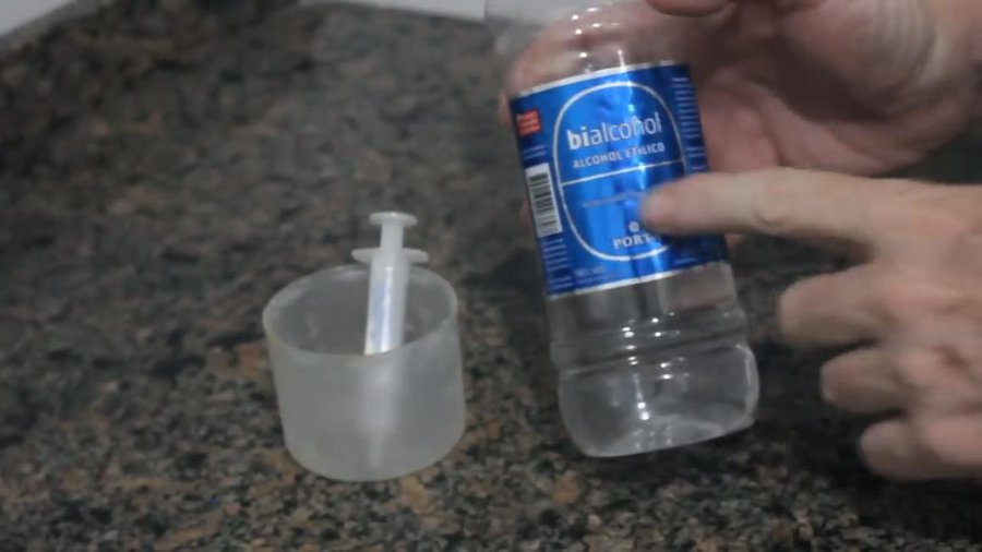 Ahora vas a necesitar alcohol etílico que es el mismo que tenemos en el botiquín de casa para curar las heridas, un recipiente donde colocarlo y una jeringa descartable...