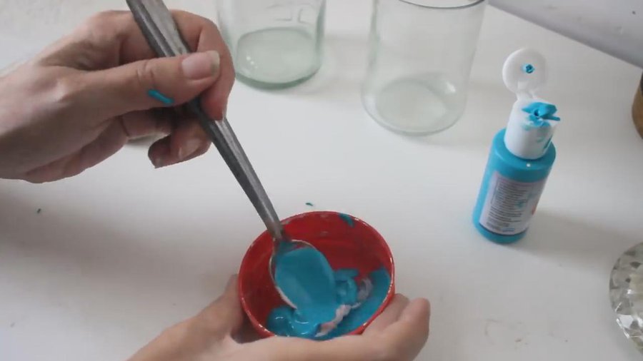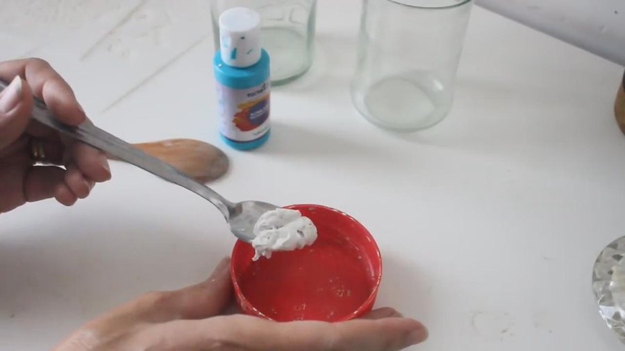 Para hacer la decoración de tus recipientes prepararás una pintura que pueda adherirse a la superficie del vidrio utilizando enduido plástico (pasta muro, reparador de paredes o tapajuntas) y pintura acrílica del tono de tu preferencia.