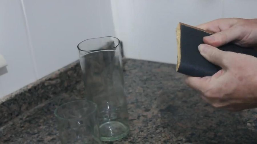 Antes de comenzar a pasar la lija por el filo tienes que humedecerla, para eso puedes utilizar el mismo recipiente con agua en el que habías sumergido la botella. Irás pasando la lija por el borde y humedeciéndola de forma alternada...