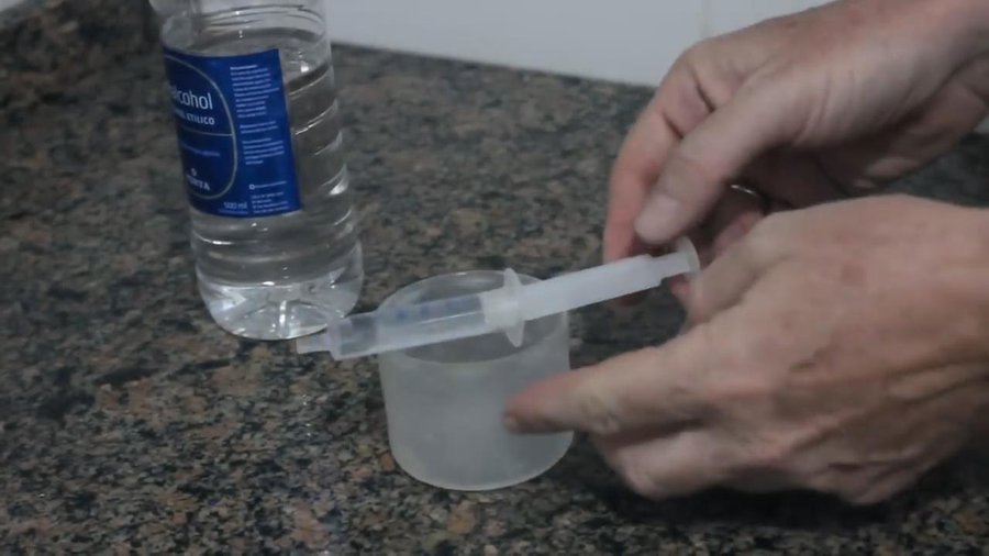 Colocarás un poco de alcohol en el recipiente y lo absorberás con la jeringa hasta que ésta se llene...