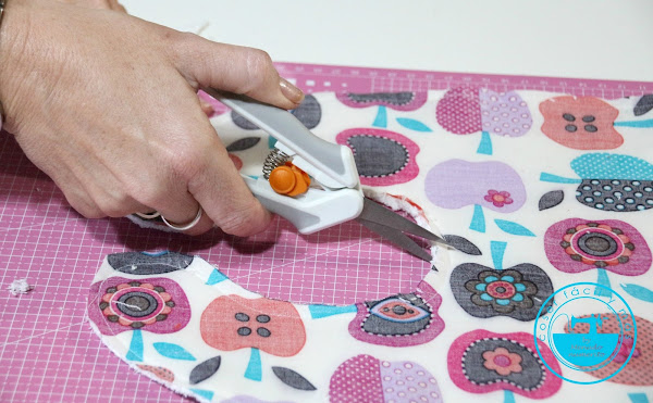 Usa el patrón para cortar una pieza de tela estampada para el frente y una pieza de tela de toalla, enfrenta los derechos y cose todo alrededor dejando unos 8 cm sin coser.