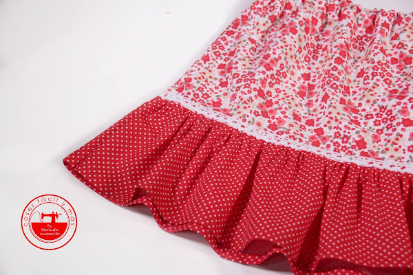 Mis pieza de tela miden 42 x 28 (cada una de las 2 piezas de tela estampada) y 150 x 14 la pieza del volante. La falda es para una talla 7-8 años.
