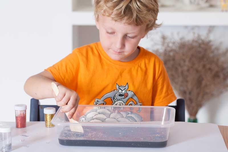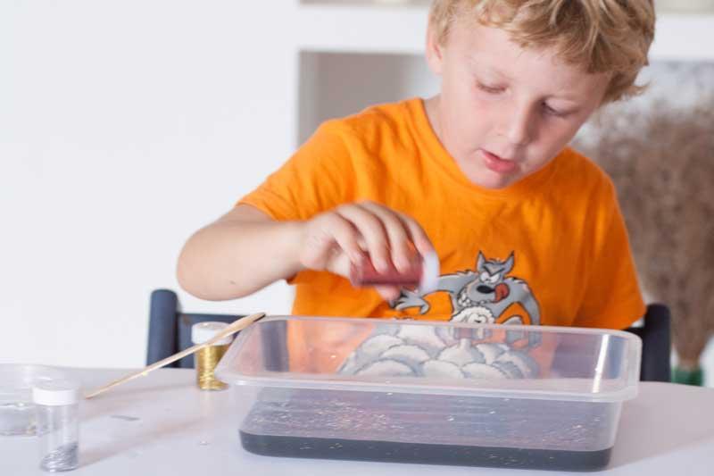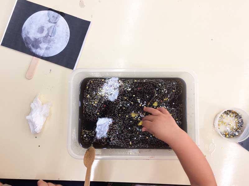 Con el agua completamente negra ya podéis pasar al siguiente paso. Preguntad a los peques que les parece ¿puede ser el espacio? además de ser completamente negro ¿qué hay en el espacio? ¿hay estrellas? y así para que poco a poco vaya introduciendo los materiales dentro de la bandeja y vaya creando su galaxia.