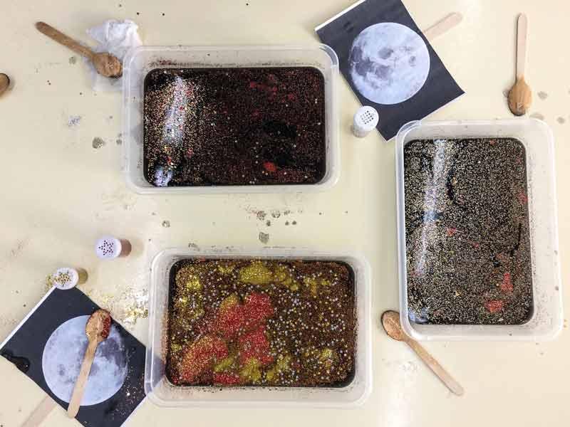 Conforme vaya añadiendo purpurina y removiendo se irán creando pequeñas galaxias súper curiosas que os dejarán con la boca abierta.