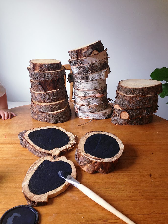Corta "rodajas" de un tronco para usarlas como pizarra de mano. Prepara la superficie lijando y a continunación da una capa de pintura.
