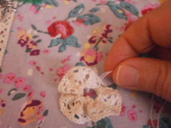 Luego con dos colores de puntilla hice una flor, con una aguja e hilo e ido atravesando la aguja por toda la tira para cuando acabara tirar del hilo y la puntilla quedara así fruncida haciendo la forma de una flor. Hice lo mismo con otra puntilla de otro color, esta vez un poco mas grande que la primera. Pegue una encima de otra y le puse un abalorio en medio de la flor.