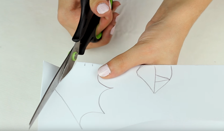 Dobla la hoja de papel por la mitad y dibuja medio murciélago y medio labio. Recorta ambos y abre el papel para tener las siluetas enteras.