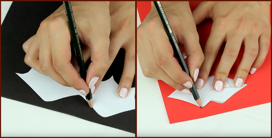 Repasa el contorno del murciélago sobre la goma eva negra y recórtalo. Después haz lo mismo con el labio y la goma eva roja.