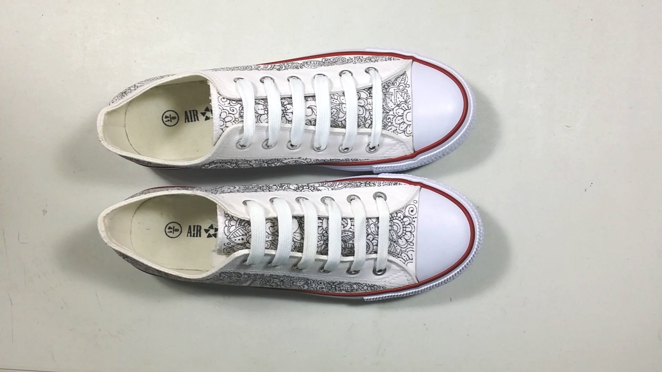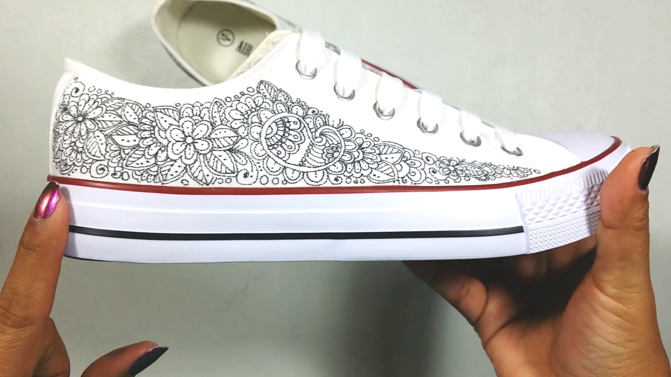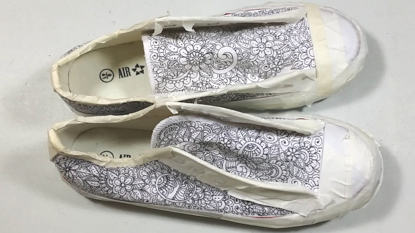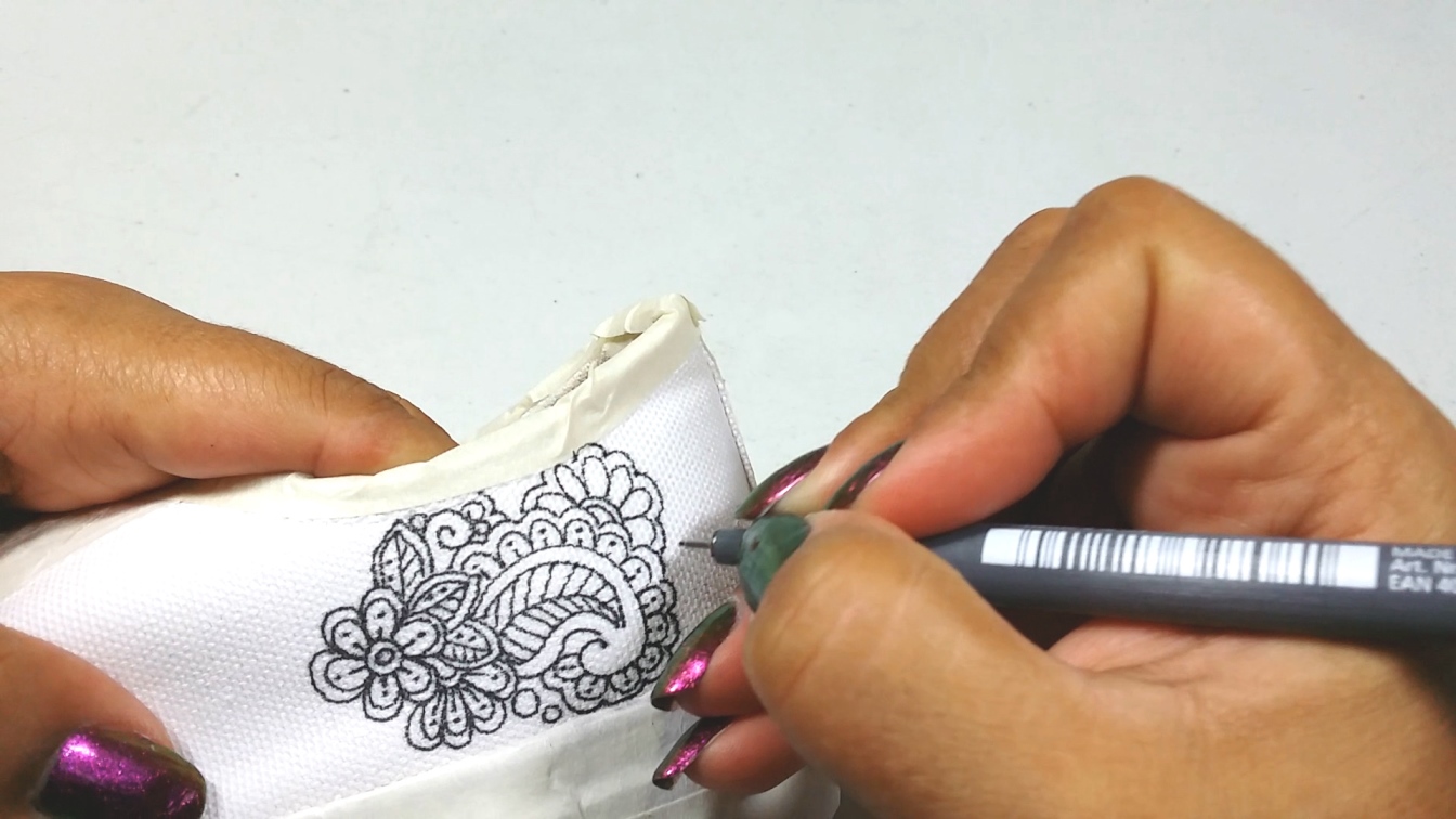 Comenzamos a dibujar directamente en la lona del zapato y continuamos hasta cubrirlo todo