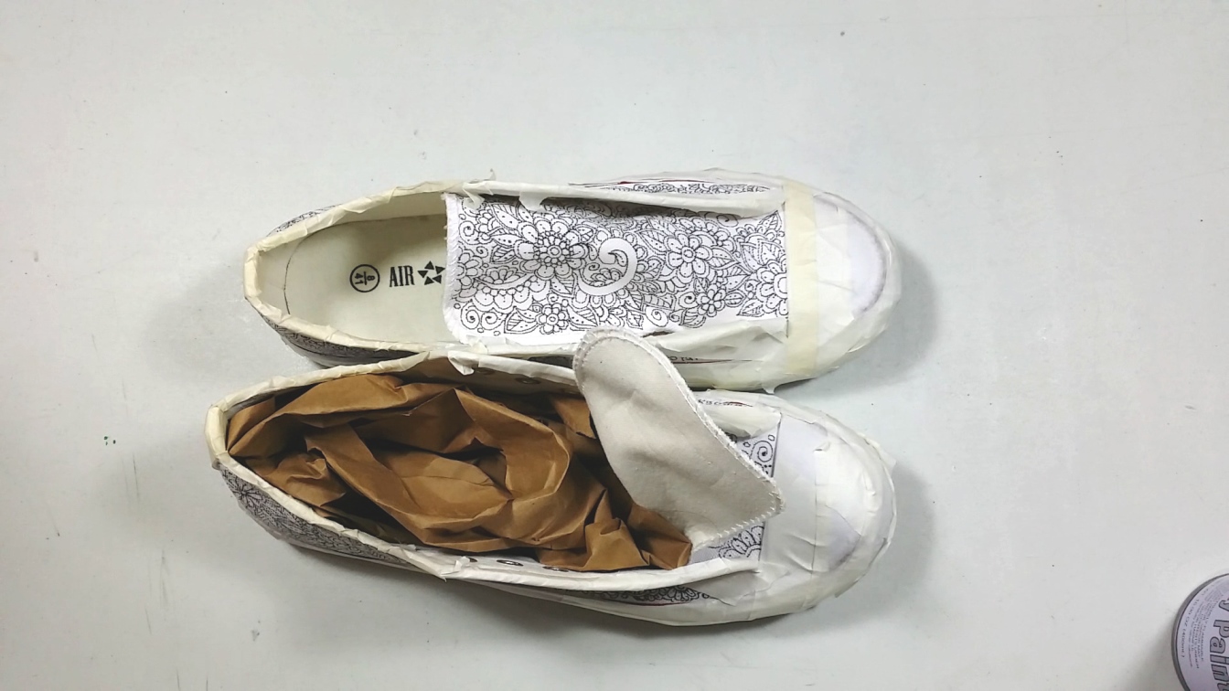 Dejamos que el aerosol barniz se seque muy bien y luego retiramos todo el papel de la parte interior del zapato así como también retiramos todo el tirro o cinta para enmascarar