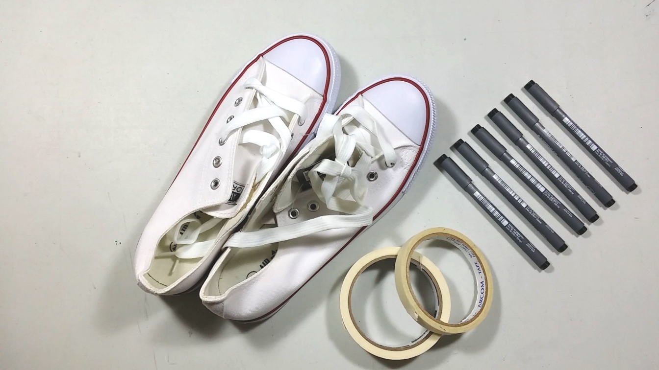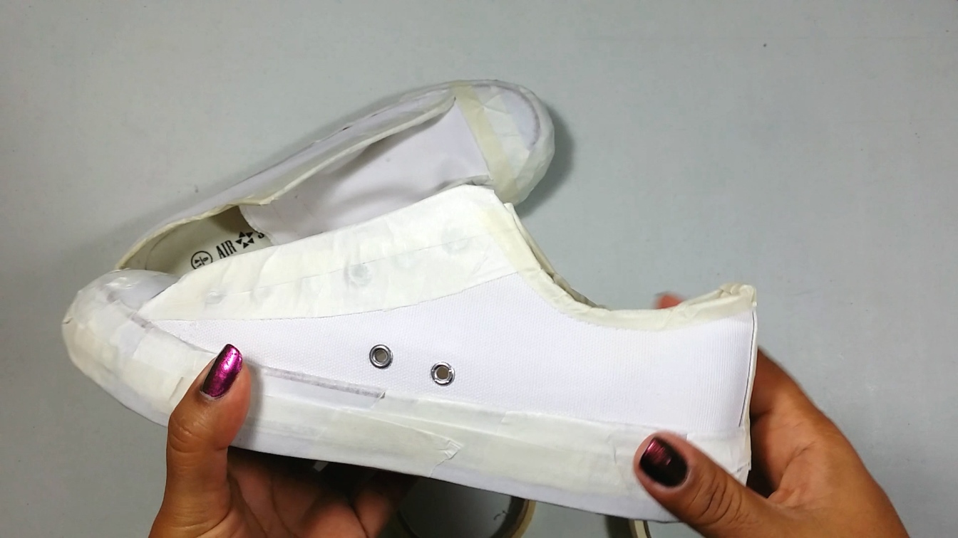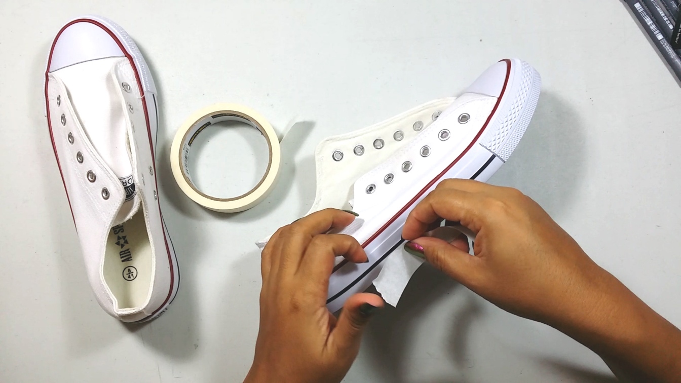 Vamos a cubrir con tirro o cinta para enmascarar las areas del zapato que queremos proteger, esto nos va a servir tanto para cuando estemos dibujando el zentangle como para cuando vayamos a aplicar el spray barniz