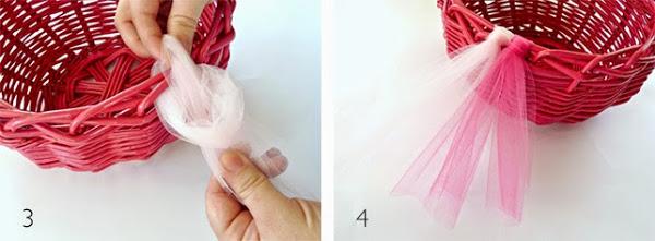 2- Empezamos a pasar las tiras de tul por entre medio el mimbre.