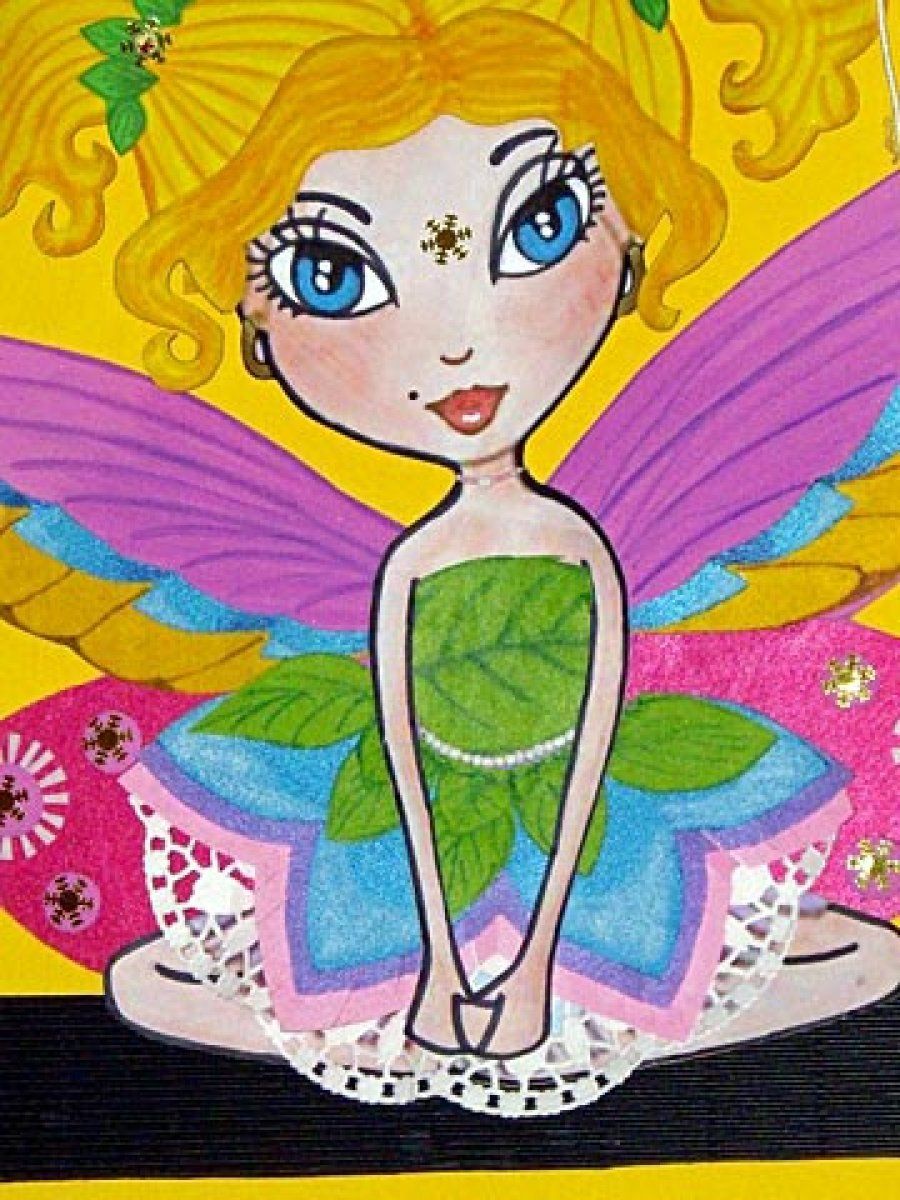 El cuerpo del hada, rico en texturas: está hecha de goma eva, con las faldas de fieltro y una enagua de blonda de pastelería.