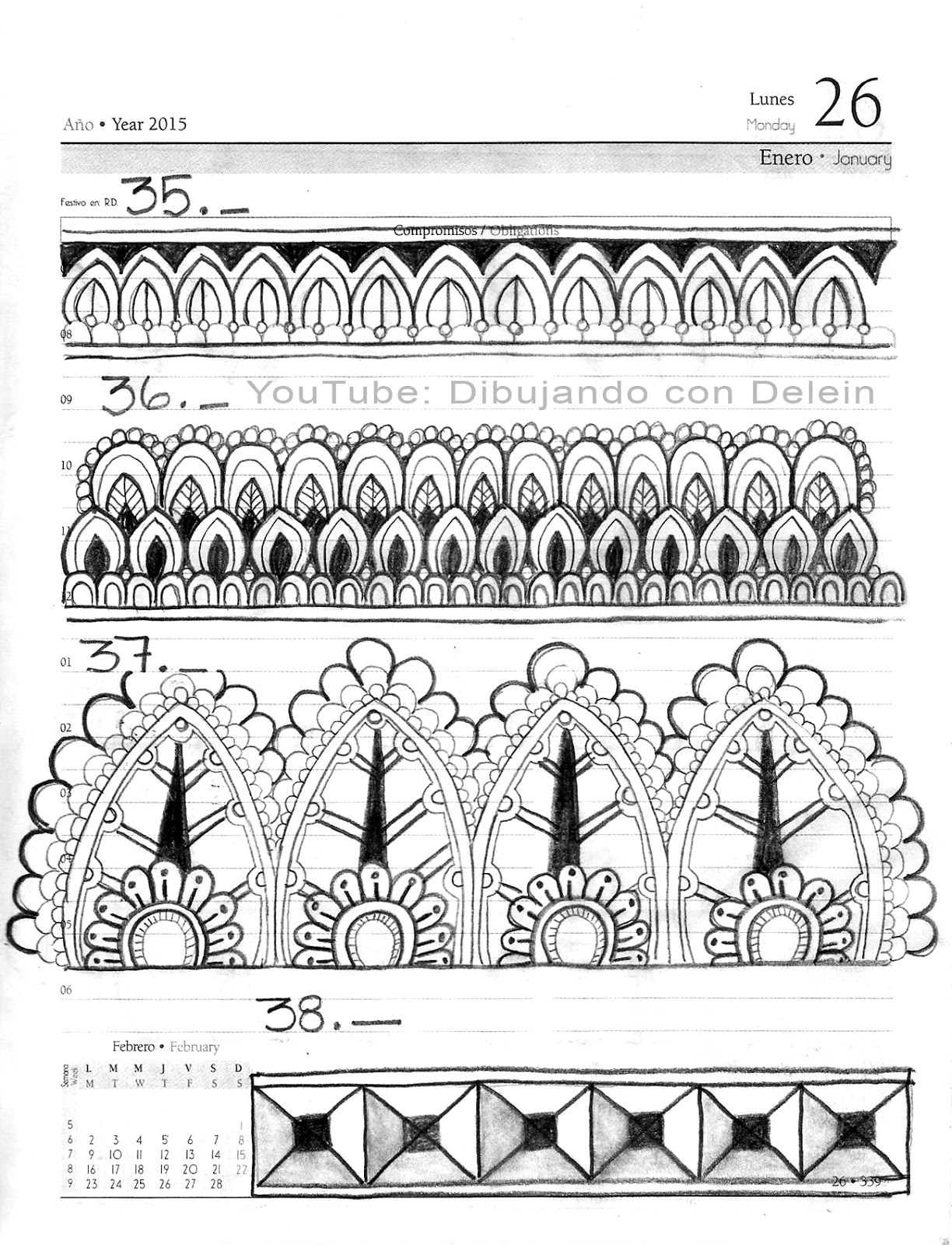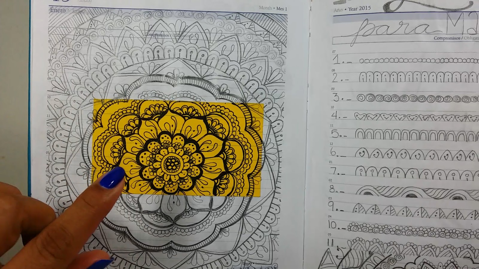 Una de las cosas que me ha ayudado a agilizar el proceso creativo de mis Mandalas, es que me auto impuse el reto de crear 100 lineas para Mandalas y esto me sirve de inspiración, no necesariamente voy a hacer las lineas tal cual como las he dibujado en el mostrario, pero me da ideas y me ayuda a avanzar de una manera mucho más rápida.