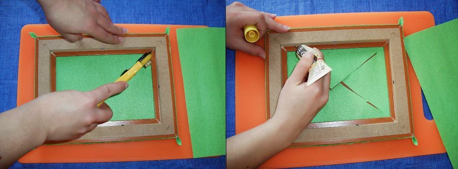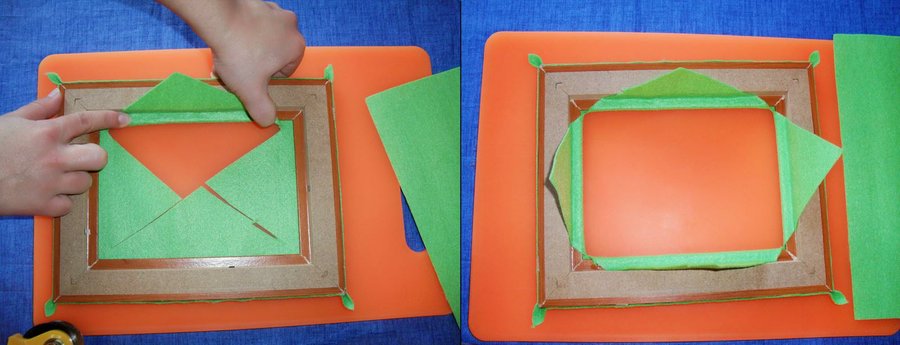 9. Ahora haremos unos cortes en diagonal en el fieltro yendo de una esquina a otra. Yo he utilizado el cúter, pero también se puede hacer con las tijeras. Es muy importante que el corte no llegue hasta el final de la esquina, dejad como medio centímetro de distancia. De esta manera no se verán partes del marco en las esquinas cuando terminemos. Después de eso ponemos pegamento en uno de los laterales (pero sin que llegue hasta la esquina, ya que el fieltro no abarcará tanto espacio) y llevamos uno de los picos hacia arriba. Presionamos para que se fije bien, a veces tarda un poco así que tened paciencia. Repetimos con cada uno de los laterales.