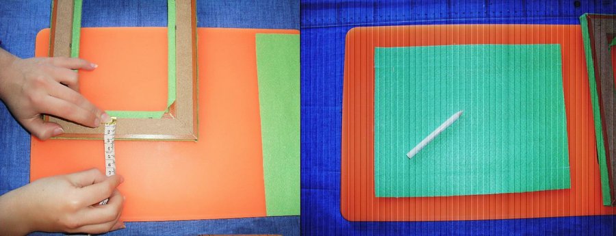 5. Una vez pasadas las medidas al fieltro ya podemos cortar. Después hay que centrar la parte frontal del marco en la pieza de fieltro, si tienes experiencia puedes hacerlo más o menos a ojo, pero si no estás segura/o utiliza un metro. Haz una pequeña marca en cada esquina del fieltro (con un lápiz por ejemplo, con un puntito basta) para que luego te sirva de guía.