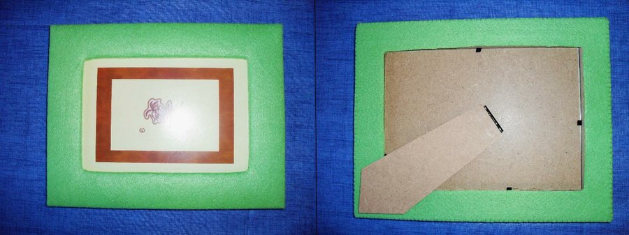 13. Ya podemos pegar ese “nuevo marco” en la parte posterior de nuestro marco. ¿Cómo aplicamos el pegamento aquí? pues esta vez hay que ponerlo en la parte interior del marco, bien en el borde, porque esa parte no va a ir cosida, la parte exterior no necesita pegamento ya que la vamos a coser.