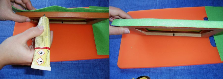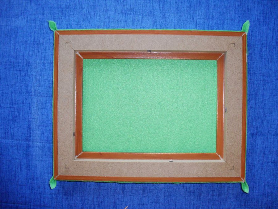 6. Ponemos unas gotas de pegamento en cada esquina de la parte frontal del marco, ya podemos darle la vuelta y hacer coincidir cada esquina del marco con las cuatro marcas que hicimos en el fieltro. Presionamos para que se fije bien.