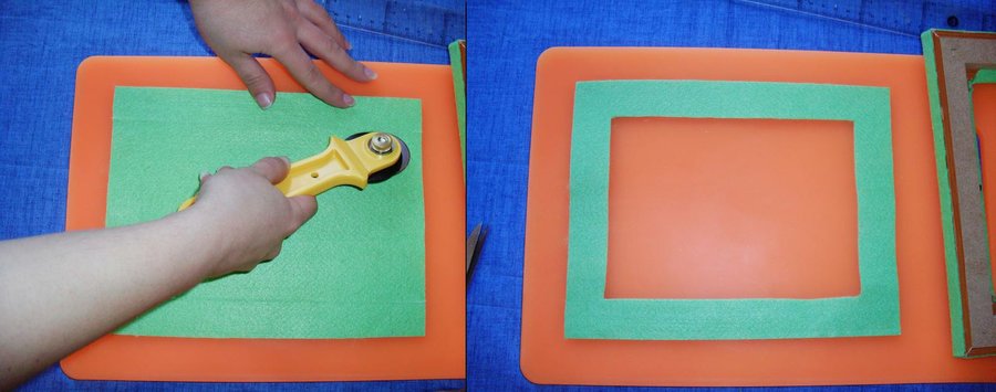 1. Colocamos el marco encima de la pieza de fieltro, de tal forma que el cristal quede bocarriba, y con el cúter cortamos alrededor del marco dejando un poquito más de espacio (con 2 o 3 milímetros por cada lado es suficiente) para que luego sea más sencillo juntar todas las piezas. Recuerda poner algo debajo (una tabla, un cartón gordo…) para cortar, sino estropearás la superficie sobre la que estás apoyada. Si en lugar de cúter utilizas tijeras, tendrás que medir primero la base del marco y luego trasladar esas medidas al fieltro (añadiendo 2 o 3 milímetros más por cada lado), y después ya cortar. Guarda ese rectángulo que luego lo usaremos.