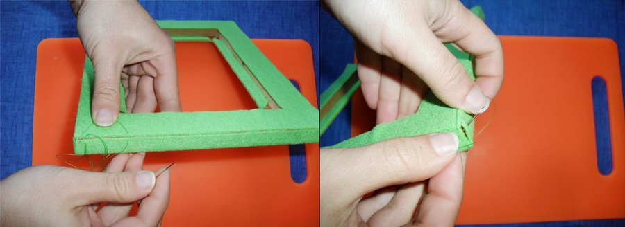 14. Y ahora llego el momento de coser para unir las dos partes del marco. Yo utilizo siempre la puntada de cadeneta, tanto para los marcos como para cualquier otra de mis creaciones, es muy sencillito y queda genial. También hay que unir las esquinas. Un consejito, ya que se os terminará el hilo en algún punto del marco (porque si no tendríais que utilizar un hilo muy largo, y al final se os harían nudos), es mejor hacerlo coincidir con las esquinas, así que si veis que el hilo solo os va a llegar hasta la mitad de un lateral, es mejor que cortéis antes y cerréis en la esquina. Estéticamente queda mejor.