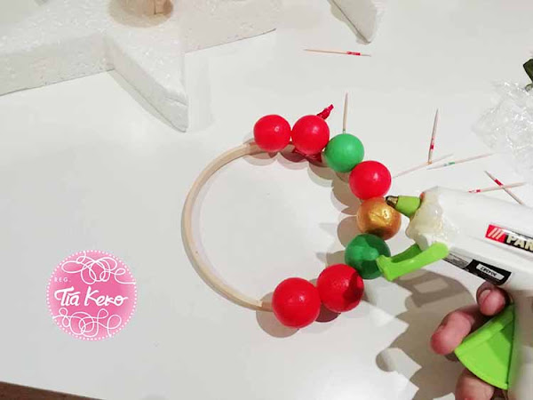 Y comenzamos a pegar las bolas en el círculo de madera con la pistola de silicona, por dentro del círculo, pro fuera, jugando con los tamaños y colores como se nos ocurra. Este paso puede ser muy divertido para los niños.