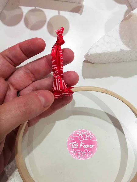 Como siguiente paso vamos a preparar la base de la corona, para ello primero vamos a poner un cordón o lazo de navidad en la parte de arriba para poder colgarlo después.