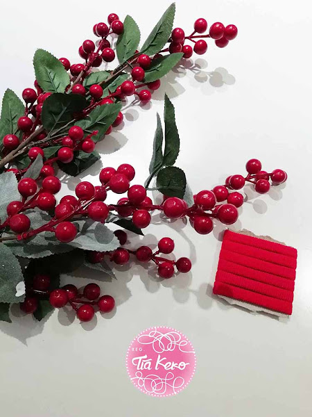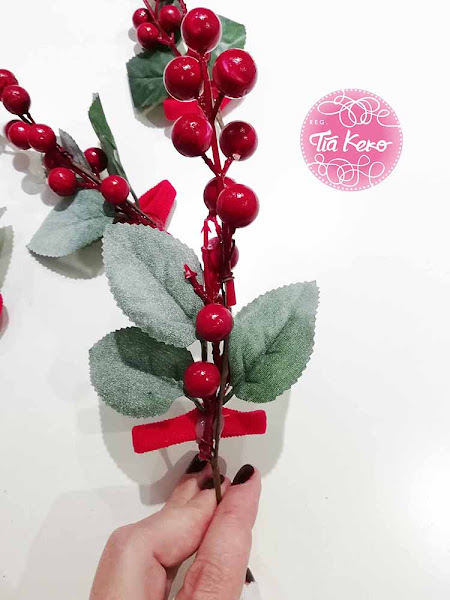 Como segundo y último paso vamos a pegar con la pistola de silicona el ramillete de flores a goma de pelo, lo dejamos secar y listo, ya tenemos nuestros salvamanteles de Navidad.