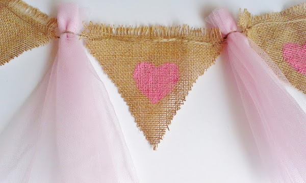 Colocamos nuestros banderines en el lugar deseado y cortamos pequeños retazos de tul y atamos al lado de cada triángulo.