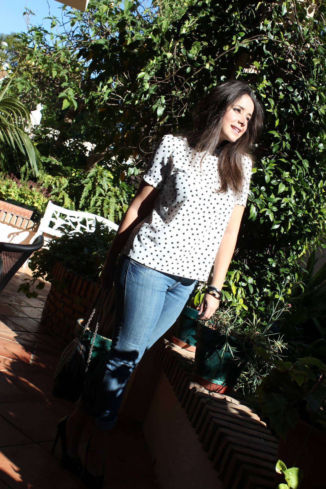 Para esta ocasión he combinado la camiseta de lunares con unos vaqueros o jeans pitillo tobilleros de H&M, zapatos de tacón negros de Massimo Dutti y bolso negro con cadenas doradas de Carolina Herrera. He aprovechado que en Málaga hace un tiempo estupendo para hacerme las fotos en manga corta... ;D