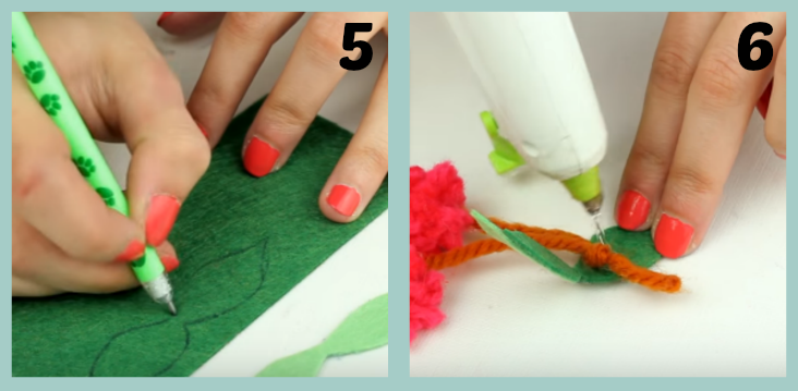 6. Por último pegamos los dos tipos de hojas de fieltro y estos al cordón de lana marrón.