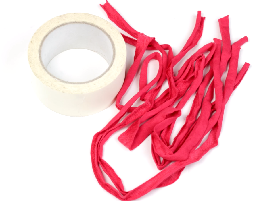 4) Solo queda cortar una tira más larga que se utilizará a modo de cadena. Con un extremo, tapa la goma elástica y haz lo mismo en el otro.