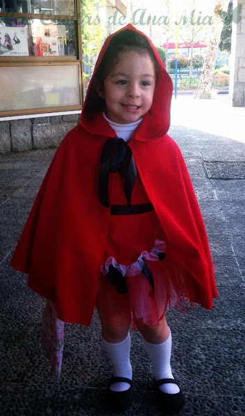 Para completar el disfraz decoré el cuello y los puños de una camiseta blanca con la misma puntilla que lleva la faldita de tul que asoma por debajo de la falda roja.