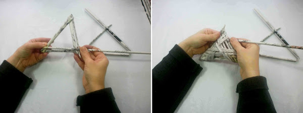 Se va tejiendo pasando siempre por detrás de cada esquina e introduciendo otra varita cuando sea necesario, hasta acabar todo el espacio del triángulo.