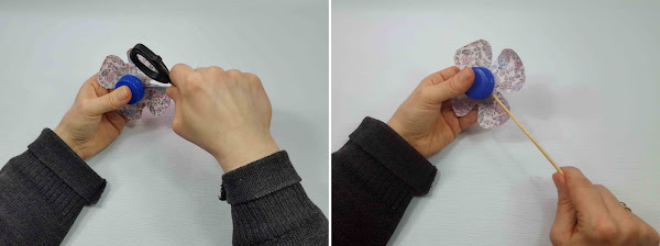 Hacemos un agujerito para poner el palito de madera. Pegamos los botones en el centro y por último hacemos un lazo con rafia o cinta verde.