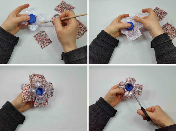 Cortamos la botella y le hacemos cuatro cortes. Después la abrimos hacia atrás y cortamos los picos de los pétalos.
