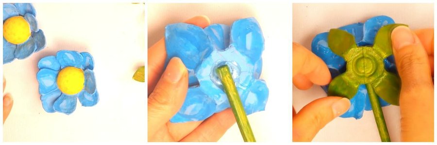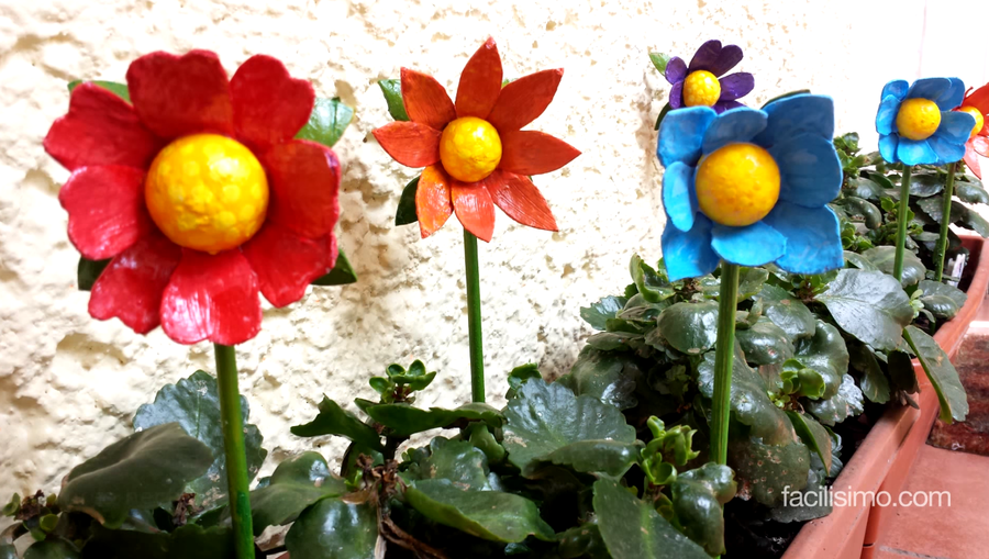 4. Por último, pinta la flor con pintura acrílica en tus colores favoritos. Tan solo queda añadir el tallo, que será un palo de madera pintado, y las hojas, que son otro conjunto de pétalos en color verde. ¡Listo!