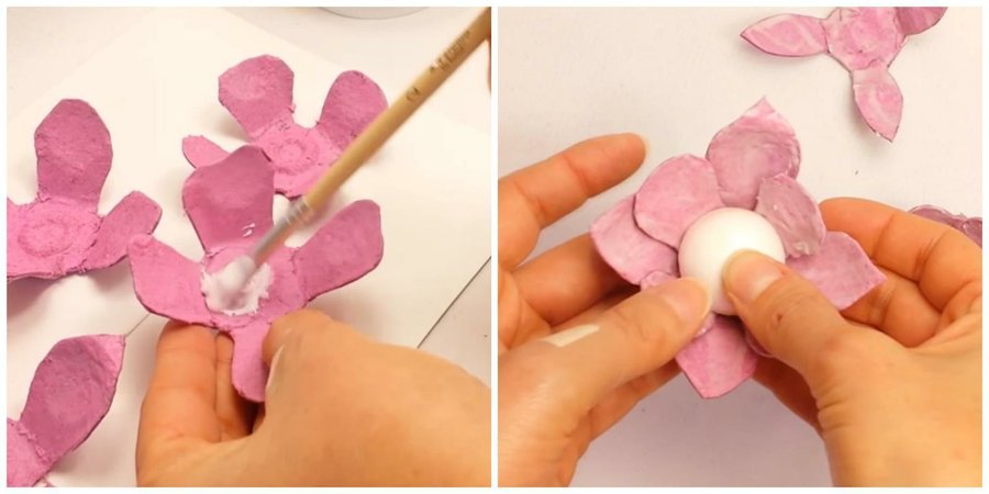 3. Realiza una mezcla con pegamento blanco y yeso y aplícala a todos los pétalos para que aumente su resistencia. Cuando estén secos, debes formar una flor con dos conjuntos de pétalos, es decir, que cada flor tendrá un total de ocho pétalos. Pega uno encima de otro y al final añade una bola de poliestireno que será el centro de la flor.