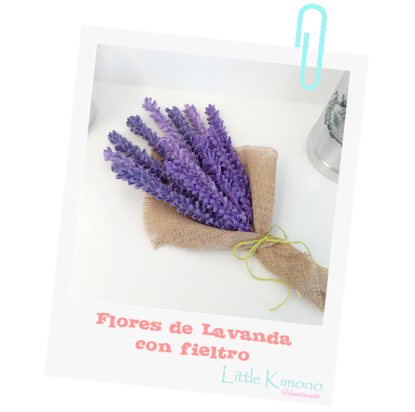 Recortaremos tiras de fieltro de 2 x 20 cm aplicamos silicona a un lado del fieltro doblamos y pegamos por la mitad. Le hacemos unos cortés a toda la tira de fieltro. Aplicamos una gota de silicona en un extremo y pegamos el palito de madera. Ahora solamente tendremos que enrollar la tira alrededor del palito, para formar la flor de lavanda y pegarlo al final. Recortamos en forma de hoja en fieltro verde. Pegamos y doblamos las hojas y a continuación las pegamos a la flor de lavanda como veis es muy sencillo de hacer y quedan muy bonitas.