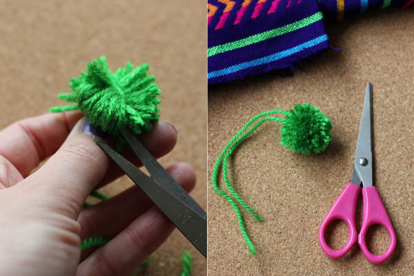 Cortamos los bucles de lana que se formaron, luego cortamos los hilos sobrantes para dejarlo bien redondo.